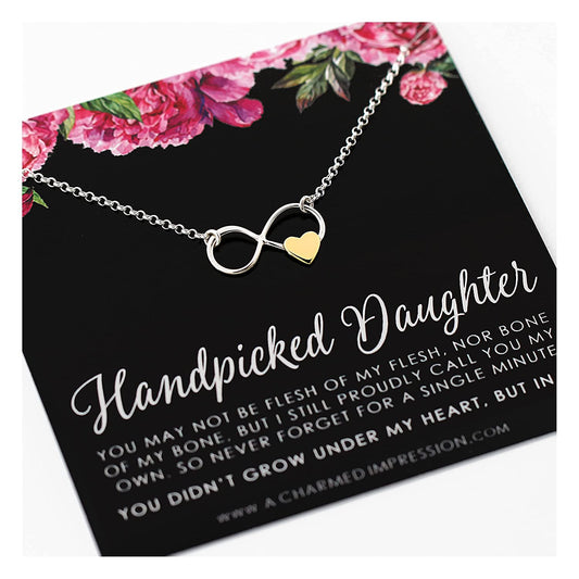 Handpicked Daughter Gifts from Mom • Unbiological Mother & Child Gift for from Stepmom • Sterling Silver • Infinity Heart Necklace • Adopted Step Daughter Stepdaughter • Quote Card Keepsake Jewelry