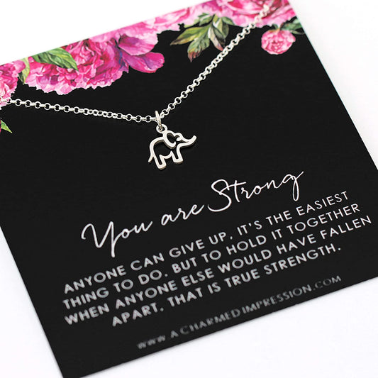 You are Strong • Inspirational Gifts for Women • Sterling Silver Necklace • Lucky Elephant Charm • Gift for Cancer Survivor, Infertility, Suicide, Recovery, Divorce, Depression • Encouragement Gifts